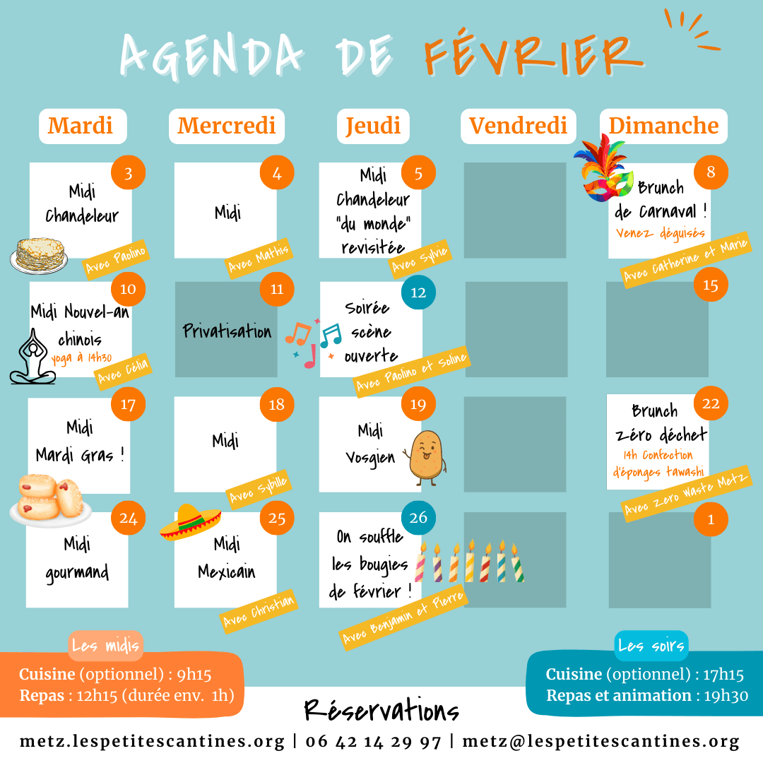 March 30, 2025Voici le portrait de Léo, en service civique dans notre cantine depuis janvier.Et merci à Anais,...June 3, 2024Ce mercredi 5 juin, ainsi que le mercredi 12 juin à 14h, Laurent vient nous proposer un atelier d...Le temps file à toute vitesse et il se passe plein de choses aux Petites cantines... Peut-être y ...Recevez notre newsletter